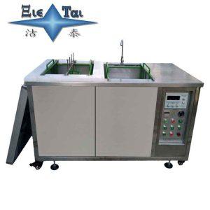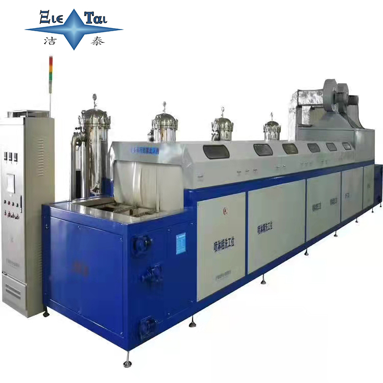 4,、采用特制網鏈傳動輸送工件,具有超聲波粗洗、超聲波精洗、鼓泡過水、切水、烘干、等功能的連續式清洗烘干設備。